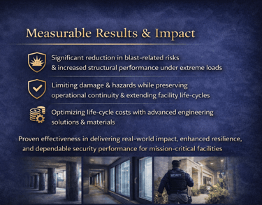 The implementation of Jordan United’s blast mitigation and structural protection solutions has delivered measurable and long-term results, including significant reduction in blast-related risks, improved structural performance under extreme load conditions, and enhanced safety for building occupants and critical assets.