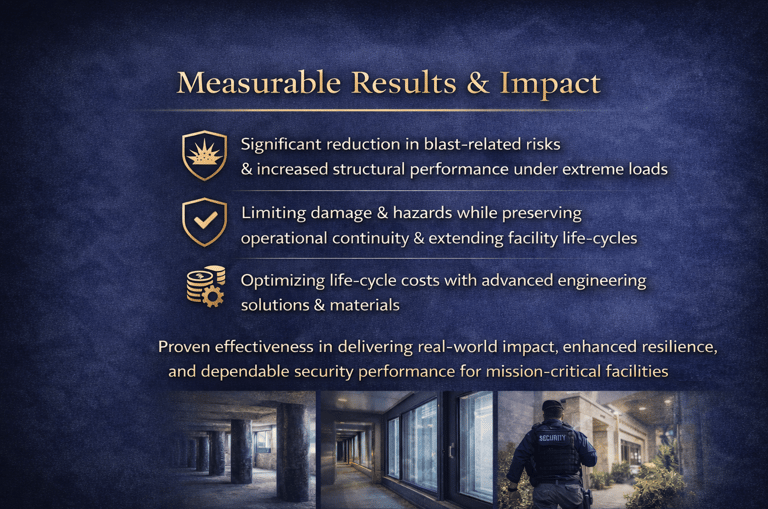 Our solutions have contributed to limiting structural damage, minimizing fragmentation hazards, preserving operational continuity, and extending the service life of protected facilities. In multiple projects, protective upgrades enabled facilities to maintain functionality and meet international safety requirements without major structural reconstruction, resulting in reduced downtime and optimized life-cycle costs.